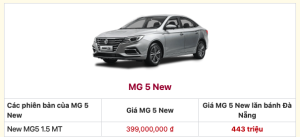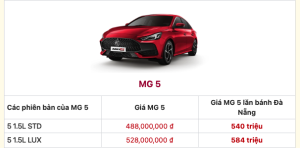 Hiện tại, mức giá lăn bánh xe MG5 tại Đà Nẵng đối với MG5 MT: 38x triệu đồng, MG5 STD: 505 triệu đồng và MG5 LUX: 550 triệu đồng. Giá chưa trừ các chương trình khuyến mãi cho khách hàng mua xe tại MG Đà Nẵng.