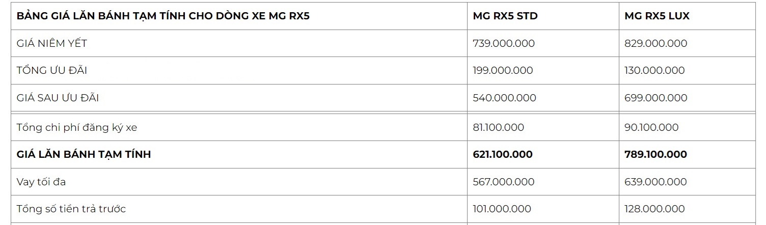 Hiện nay MG Đà Nẵng có khuyến mãi 10 triệu đồng cho khách hàng mua xe MG RX5, như vậy giá lăn bánh xe MG RX5 tại Đà Nẵng sẽ là: MG RX5 STD: 611.000.000 đồng, MG RX5 LUX: 779.000.000 đồng.