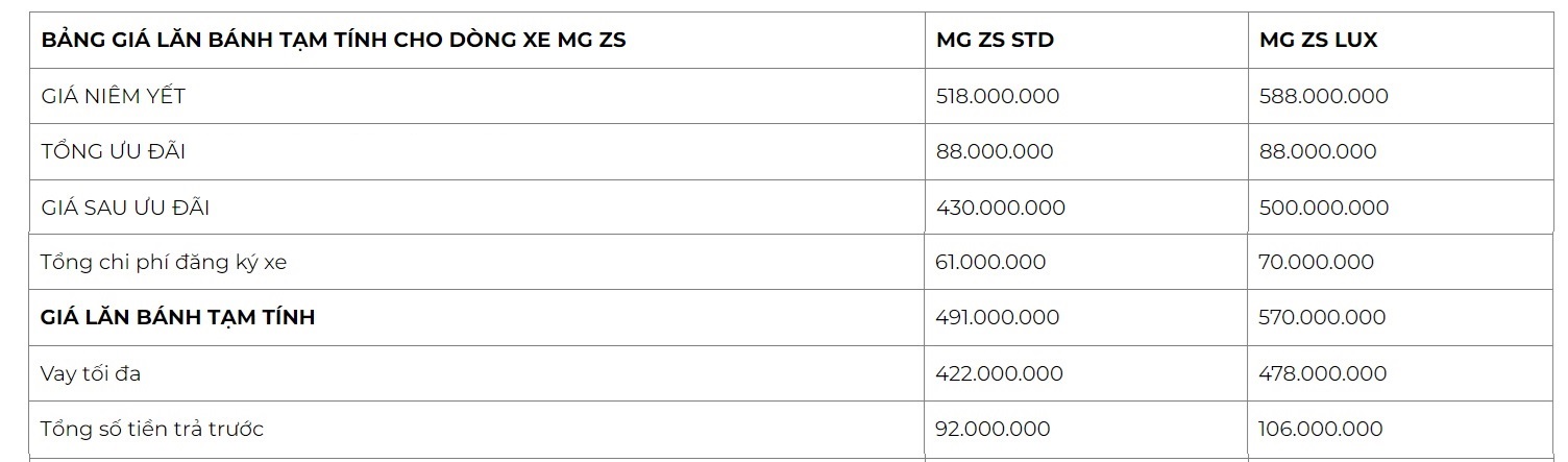 3/ Giá lăn bánh xe MG ZS tại Đà Nẵng