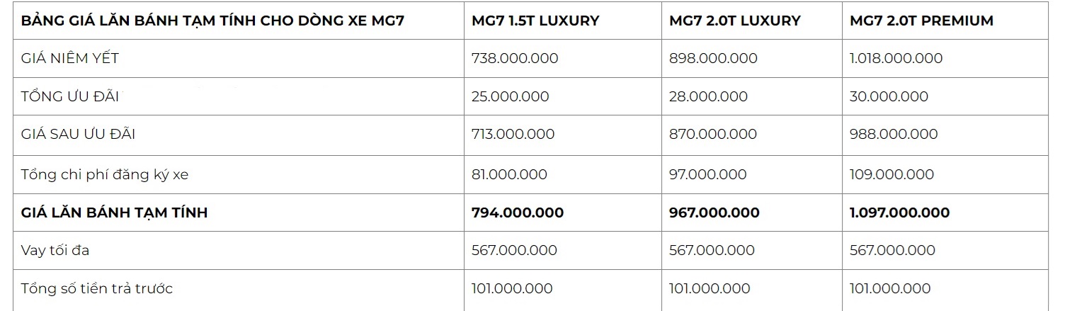 Hiện nay MG Đà Nẵng có khuyến mãi 10 triệu đồng cho khách hàng mua xe MG7, như vậy giá lăn bánh xe MG7 tại Đà Nẵng sẽ là: MG7 1.5T LUX: 784.000.000 đồng, MG7 2.0T LUX: 957.000.000 đồng, MG7 2.0T PREMIUM: 1.087.000.000 đồng.